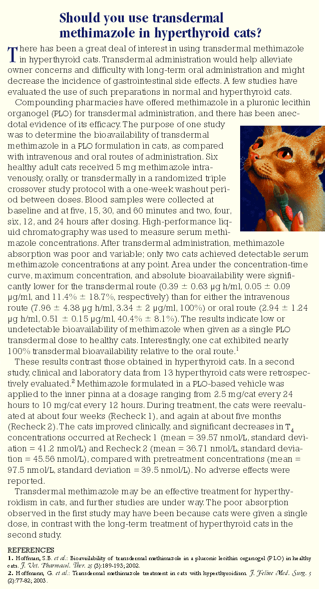 Even if your cats thyroid hormone levels return to normal after surgery they may increase later. Approved by FDA in May 2009 Felimazole contains methimazole as the active ingredient. Only one drug Felimazole Coated Tablets methimazole is FDA-approved to treat hyperthyroidism in cats.